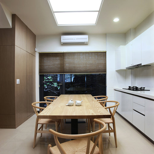 特別值得一提的是,設計團隊在開放廚房旁隱藏了一個封閉的中式快炒區,這體現了對在地生活習慣的尊重與細緻考量。此外,位於一樓餐廳側邊、環繞庭園的茶室,則提供了一個靜謐的家庭對話場景,為多代人創造了不同層次的交流空間。