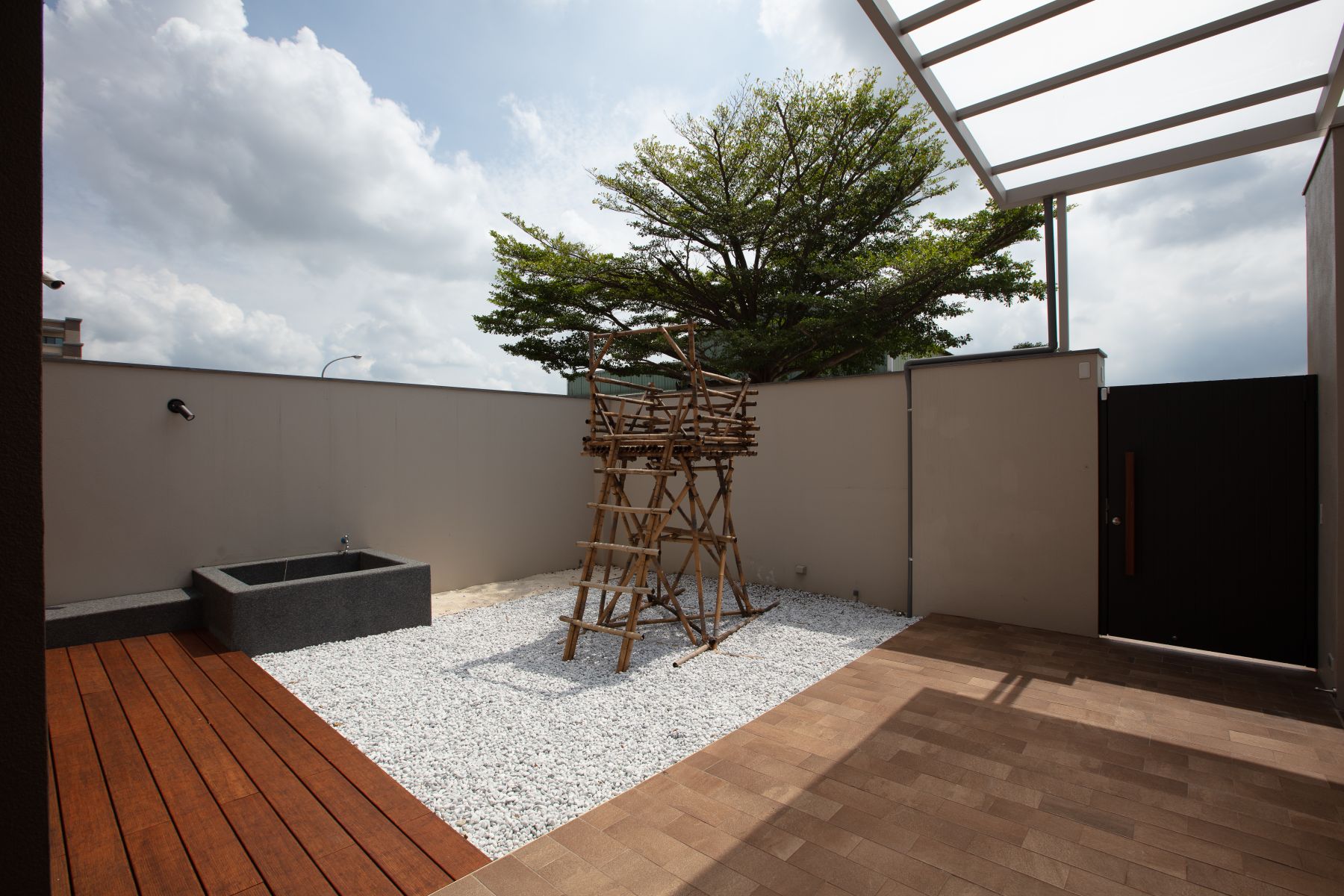 這棵大樹不僅是基地原有的住民,更是F宅最鮮明的回家指標。當屋主結束一天的繁忙,遠遠望見那蓊鬱的樹冠,心中便會升起歸屬的安定感。樹蔭下的空間成為了建築與街道之間的緩衝帶,柔軟了建築剛硬的邊界。這樣的退縮策略,讓建築體不再是拔地而起的巨獸,而是謙遜地隱身於綠意之後,讓整體環境顯得更為協調與友善。這不僅是對自然的禮遇,更是對都市景觀的一種溫柔貢獻。