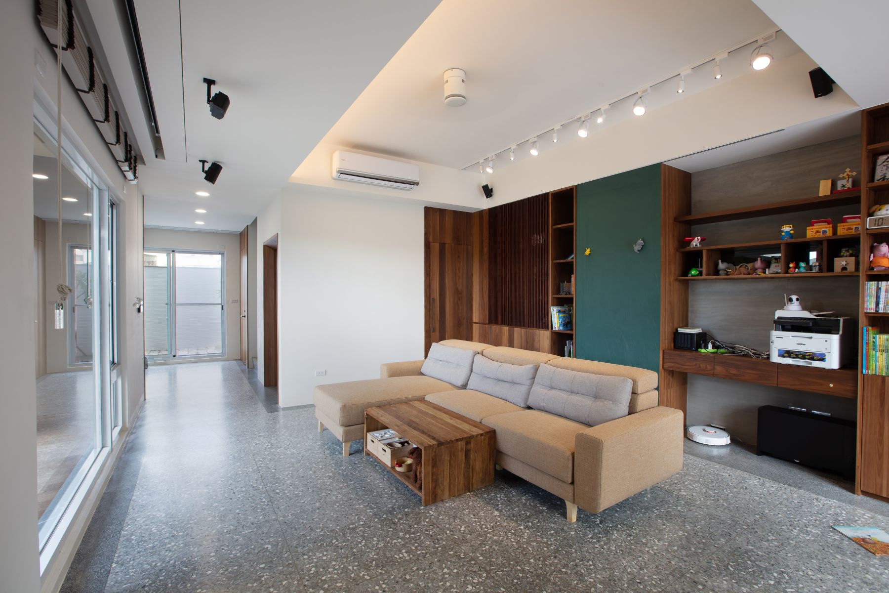 步入室內,材質的選用延續了我們對氣候與文化的思考。我們深知台南的夏季漫長,因此在地坪材料的選擇上,回歸了最適合亞熱帶氣候的傳統建材——磨石子。