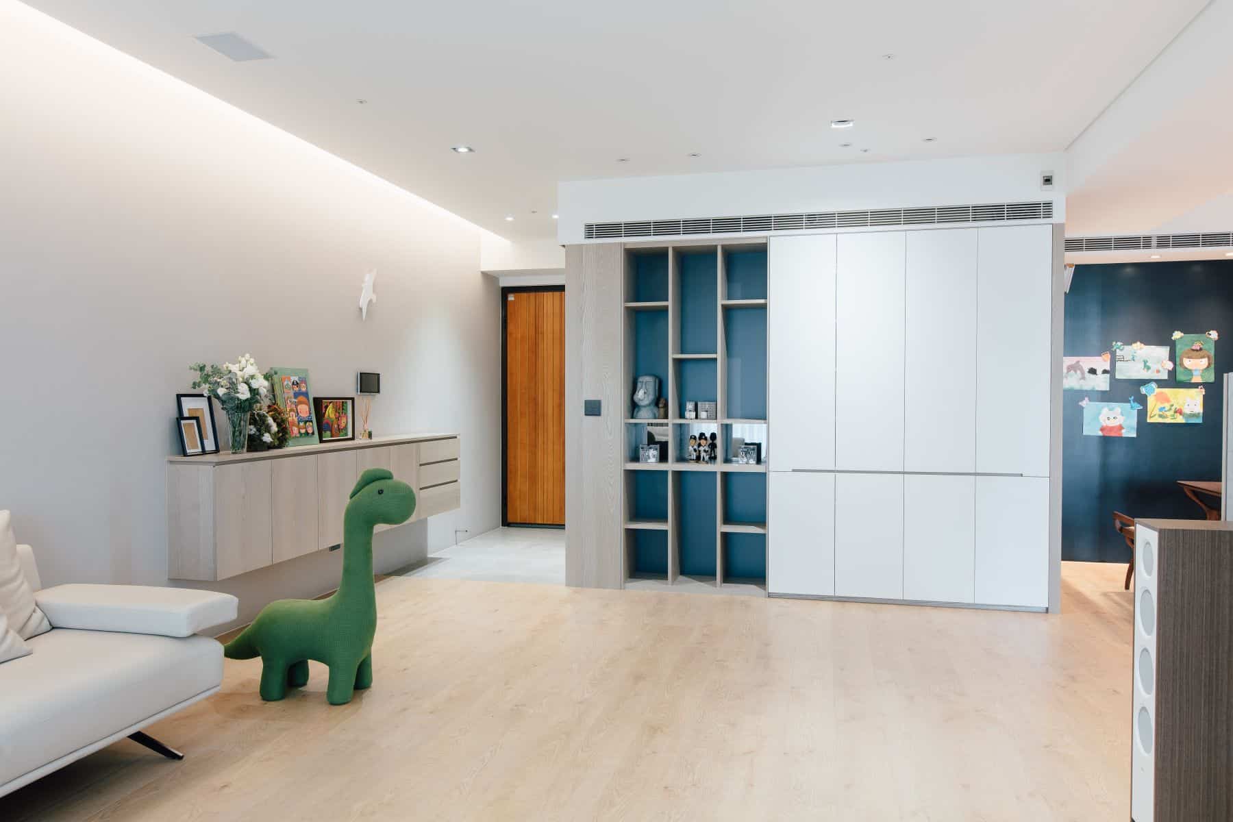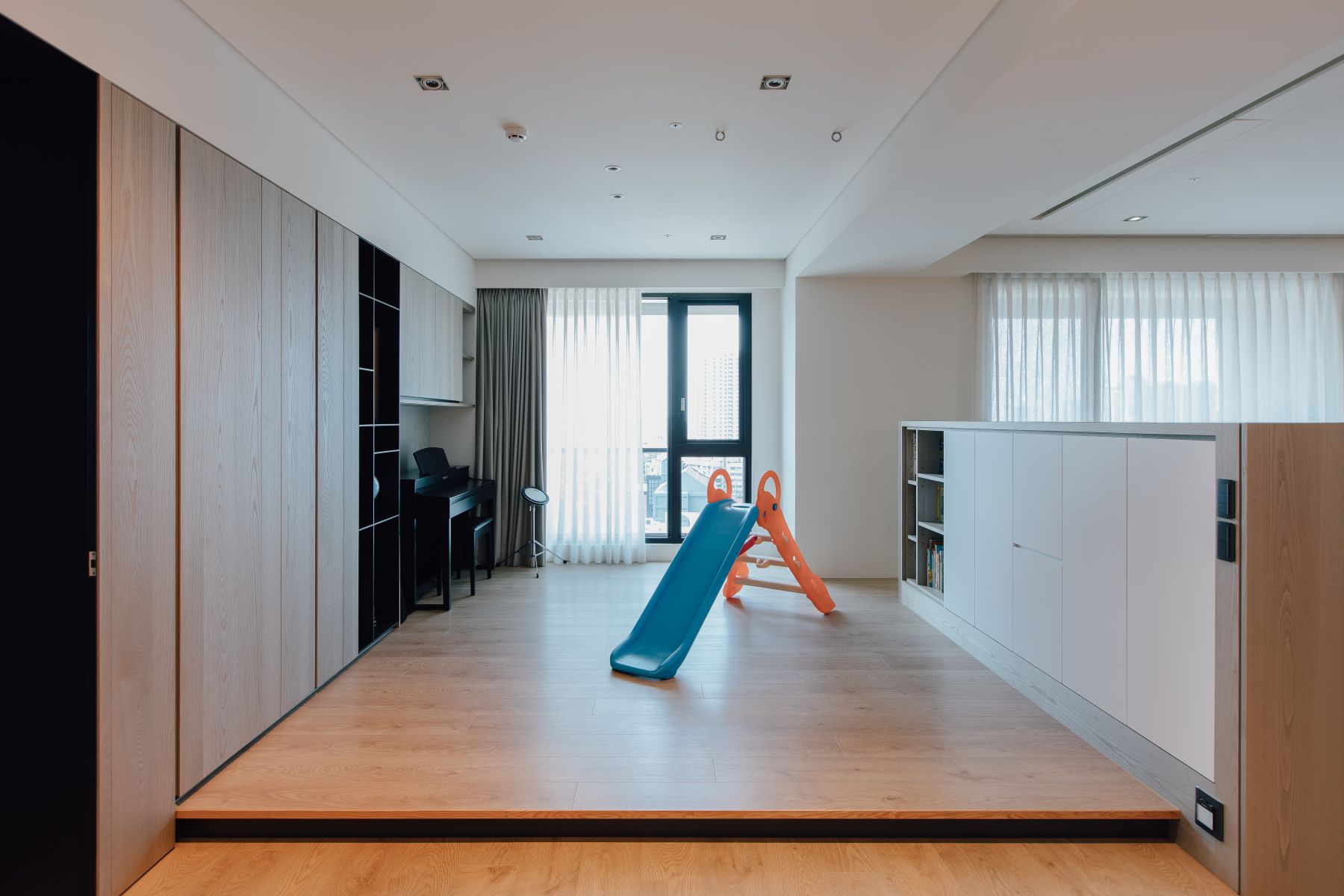 動線與機能的融合: 透過平整的地面處理,客廳與休憩區的動線被完全打通,使之成為一個可變形的多功能場域。例如,休憩區的書桌在需要時可以延伸為臨時的工作台或第二個社交區,完美展現了住宅空間的彈性與高度機能性。這種整合性設計,從根本上提高了空間坪效,並強化了家人間在不同活動時的視覺與情感連結。