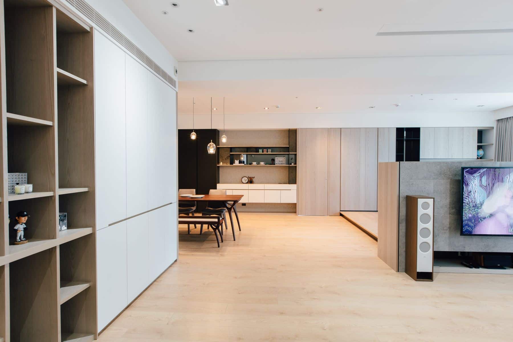 無負擔的生活空間: 透過將生活機能「隱身化」,空間得以回歸純粹。當雜物消失,楓木的紋理、光線的流動、以及精緻的細部收邊才能成為主角。這創造了一個能讓居住者心靈沈澱、無須被瑣碎環境所困擾的靜謐住宅空間。