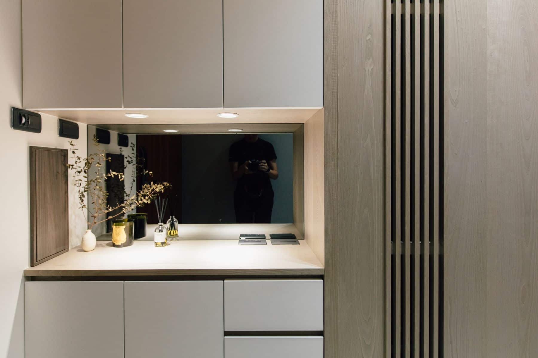 「極簡化」的細部收邊工法,這是一種超越傳統木作標準的精工要求,目標是讓櫃體與牆面達到「融為一體」的視覺效果。