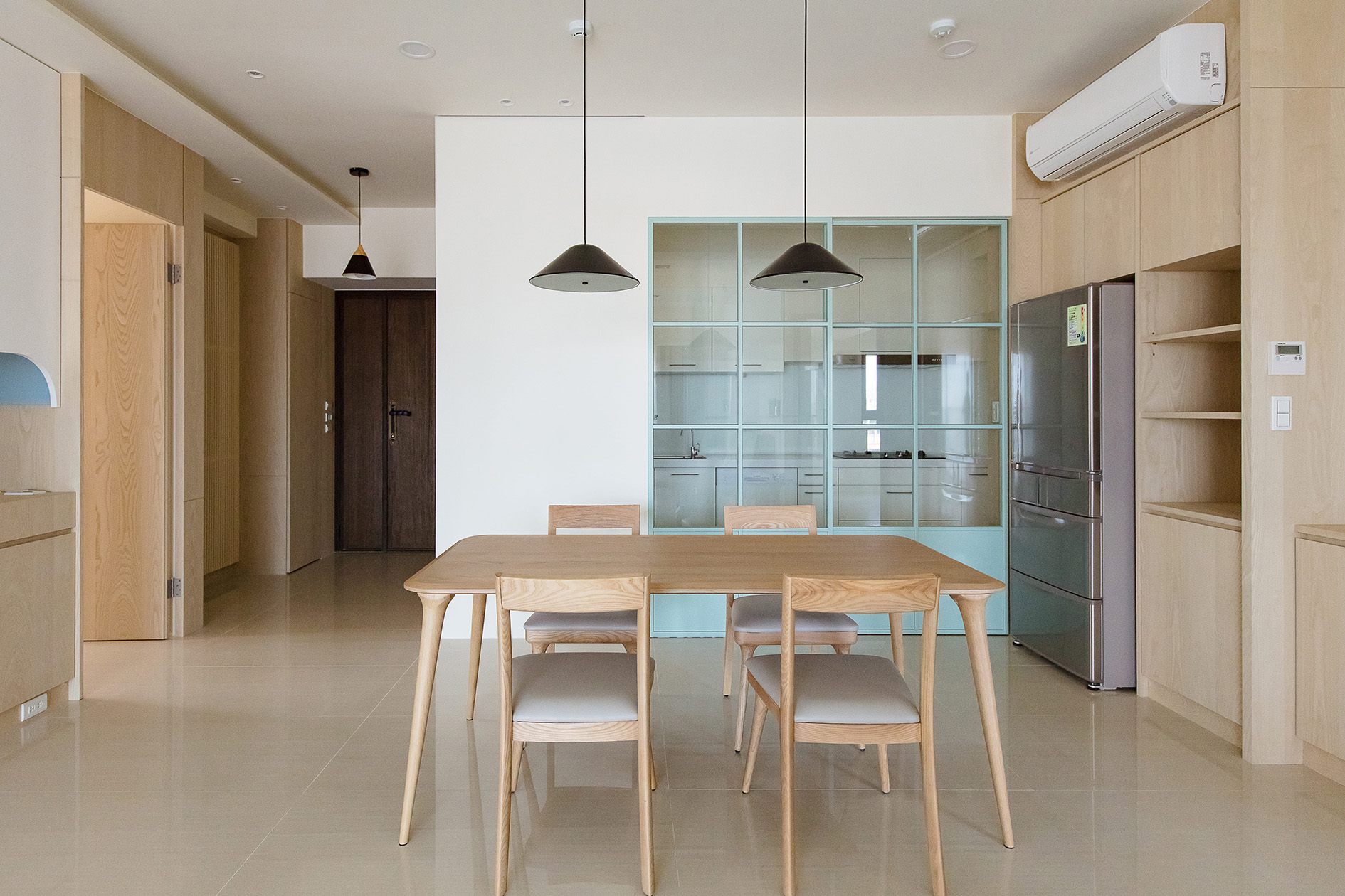 專注工作區: 位於玄關右側,背景採用沉靜的青牆。這種綠色調在視覺上帶來穩定感,有利於設計團隊進行需要高度集中精神的專業工作,營造出一個寧靜而高效的環境。