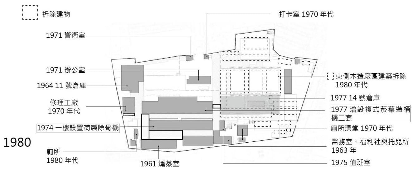 廠區內不同時期興建的青菸桶菸倉庫以及小型廠房,不只反映廠區因應產業變遷而擴廠的歷史,亦紀錄了戰後菸葉加工製程的變遷,因此在建築史和技術史方面均有其文資價值。另外遍佈廠區各處、在不同時期興建的中小型服務空間,因呈現廠區維持自身運作的生活種樣貌,而具備了歷史文化、建築史之內涵。