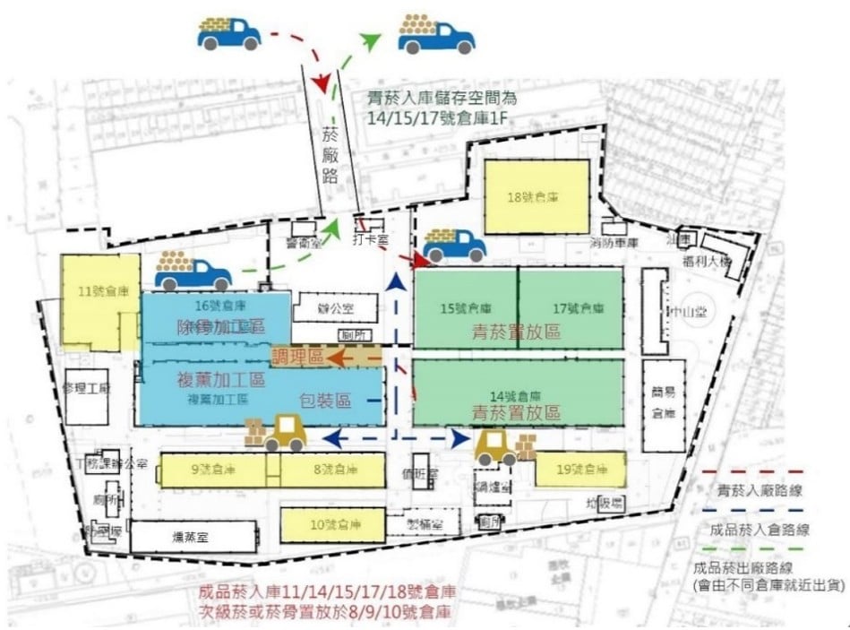 由菸區運回之青菸依序放置在14、15、17號倉庫1樓,依加工需求出倉運往調理區後進行加工,複薰完成後之桶菸與箱菸由堆高機送往物料課指定之倉庫,8、9、10號倉庫因為其建設年代太久,倉庫較為潮濕,故存放較低等之桶菸與菸骨。預出倉之菸葉則由卡車直接進到倉庫前,由堆高機協助置放,再運往所需地點。廠內運輸動線如圖 2‑4。