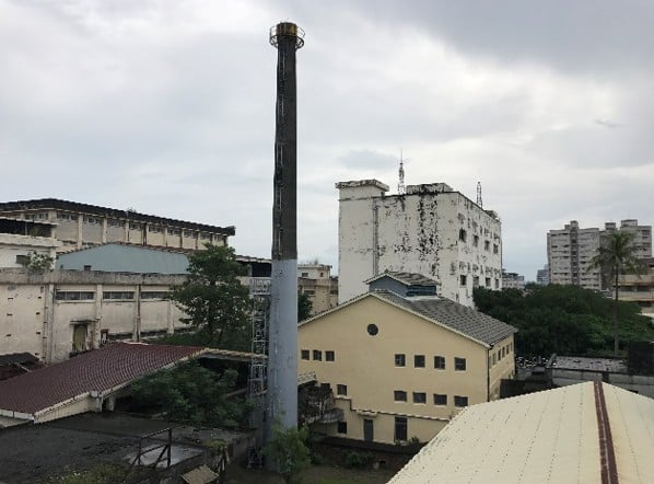 鍋爐室周邊的附屬設施包含日治時期興建的RC構造煙囪(圖 3‑6)、水塔與磚造煙道,和已拆除的鍋爐燃料煤炭儲存場;戰後興建的則有廁所與澡堂、室內鋼架平台及料儲存槽;機具方面僅有鍋爐室北側鋼桶和東側之硬水處理機以及作為給水加熱、添加鍋爐除垢藥劑的不鏽鋼桶(圖 3‑5)存留。