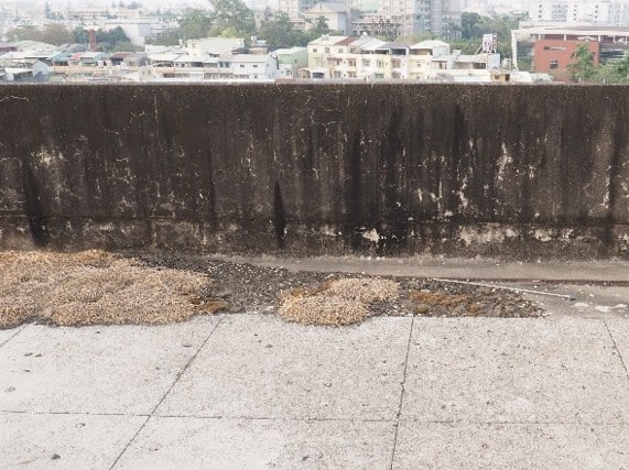 建物由柱樑系統撐起之二樓頂層樓板即為屋頂,屋頂上設有隔熱磚及水塔一座(圖 3‑72),而東西兩座樓梯上方之雨遮則以反樑系統支撐,使雨遮從樓梯延伸至二樓門口之底面能保持平整(圖 3‑73)。