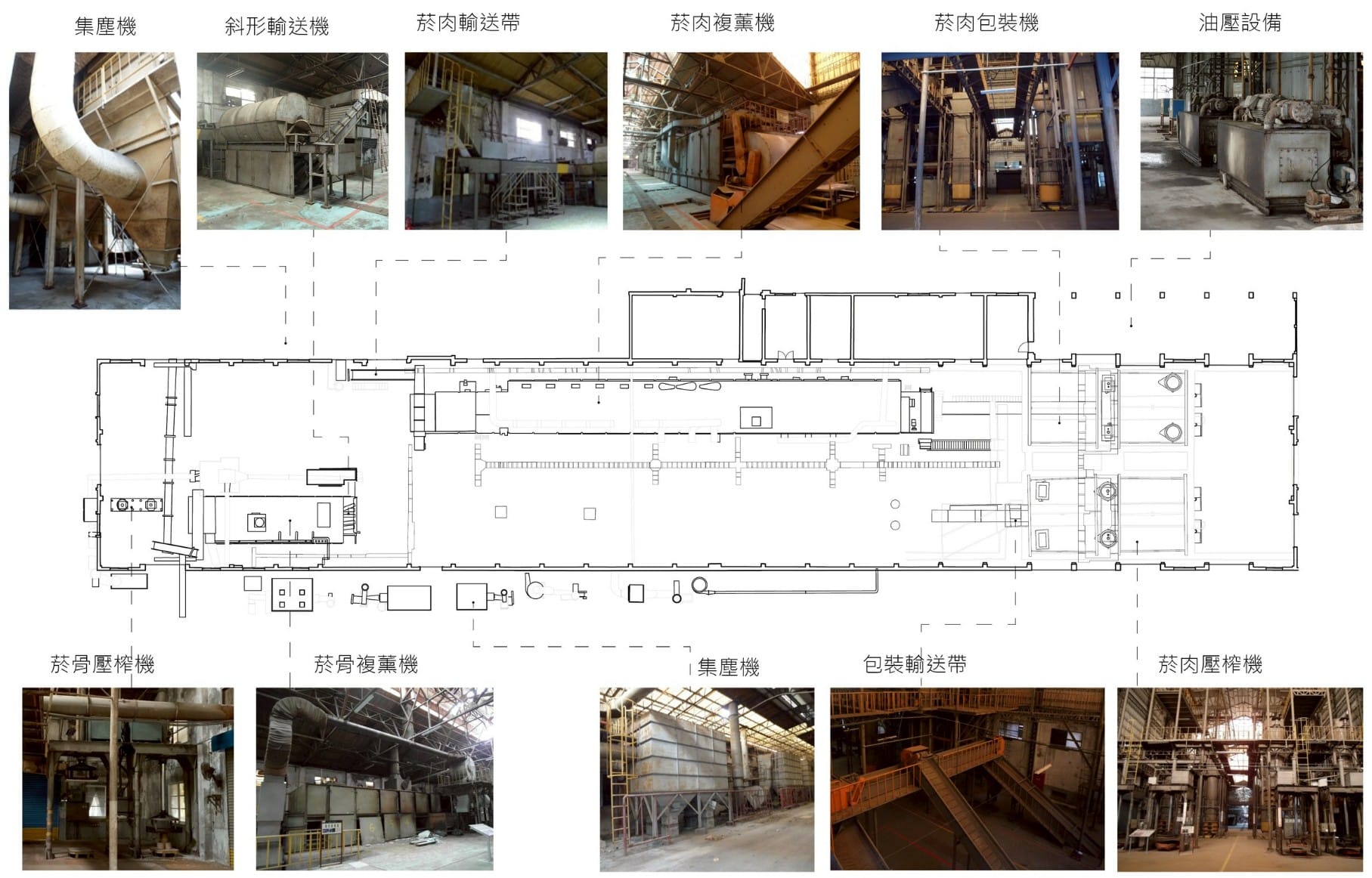 目前廠內菸葉加工機械設備是以除骨機、複薰機為主,附屬設備如真空濕潤機、除塵機、蒸氣輸送管、包裝機等,這些設備能完整呈現整套的菸葉加工流程及相關科學技術,殊具稀少性及保存價值。