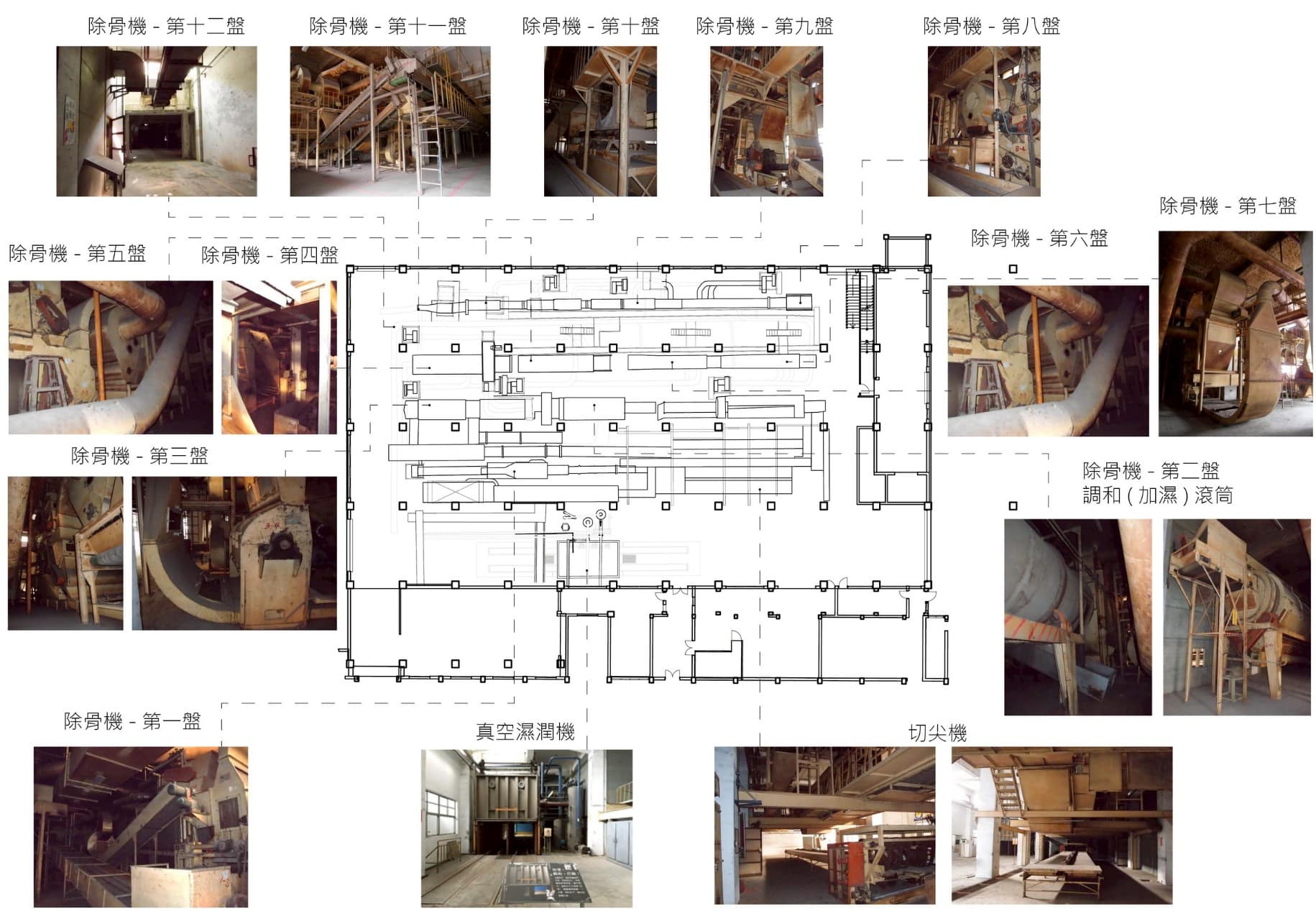 空間配置方面,16號倉庫電梯與直通樓梯設於建物東側的服務核中,而一樓南側設有幾處辦公空服務空間作為複調股的辦公室、實驗室與休息室之用;而建物四層樓的主要空間皆是無隔間的通透設計(圖 3‑8),主要空間一樓設置除骨設備,二至四樓則為倉儲空間;另外一樓東側設有一座裝卸棚、其上二樓以鐵皮包覆的露臺空間,設有配電室與機電股辦公室;另外,16號倉庫在東側服務核下設有一座地下室,為農務課倉庫;建物東南角曾則設有一座鋼棚架,轉移了複薰加工區西側原調理室的工作,使之變為修理工廠之用。