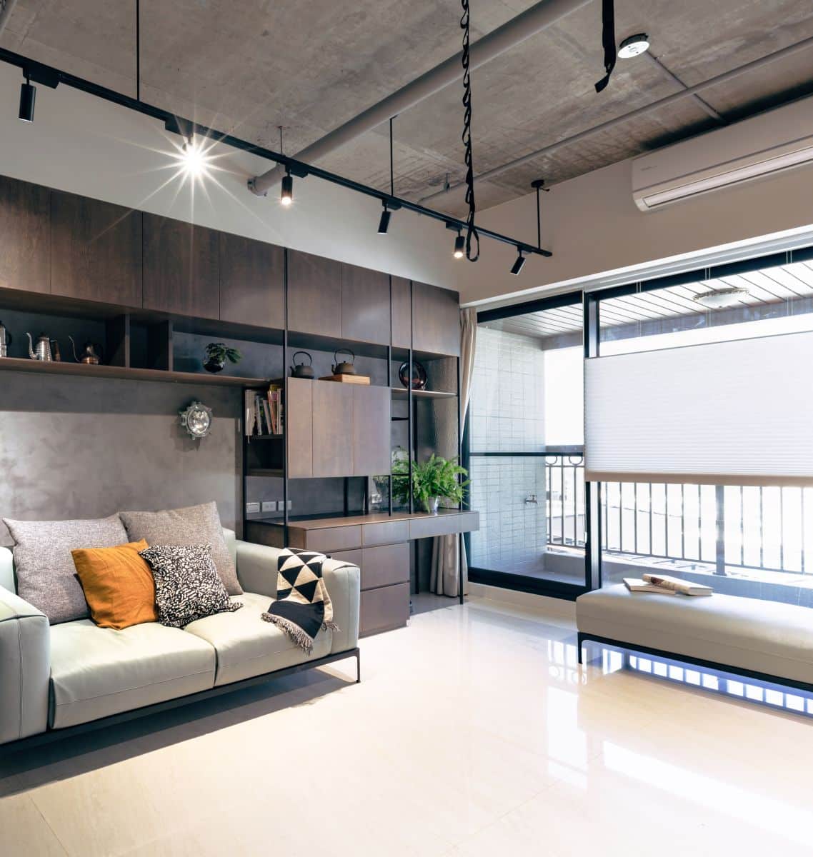 客廳與陽台的連接處,採用大面積落地窗和簡潔的捲簾設計,確保了自然光線的最大化引入,提升了室內空間的開放感和明亮度。傢俱的選配延續了整體風格,例如沙發的淺色調和金屬細腳,為沉穩的背景帶來一絲輕盈與現代感。