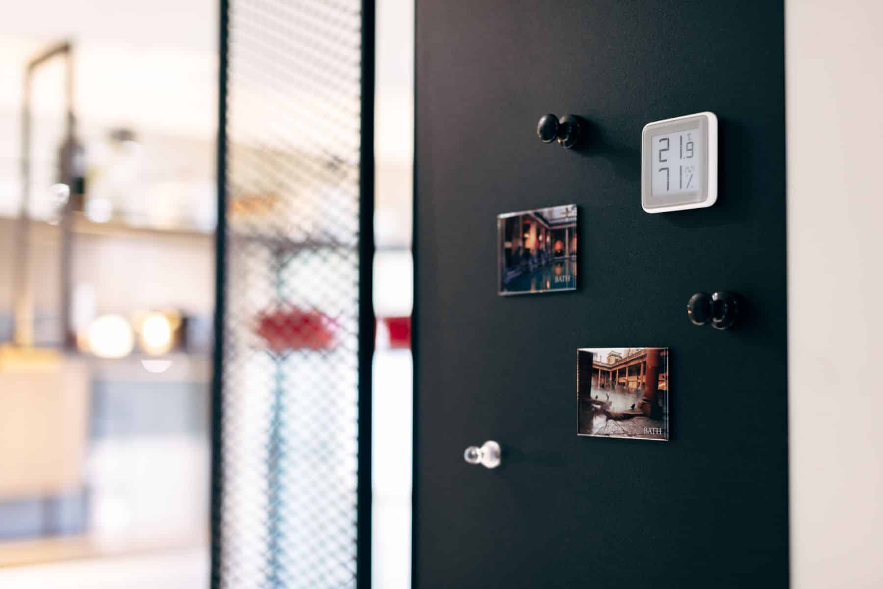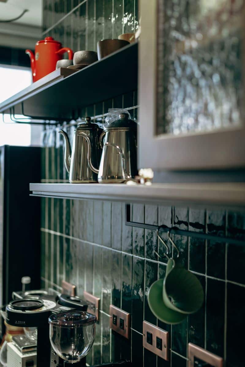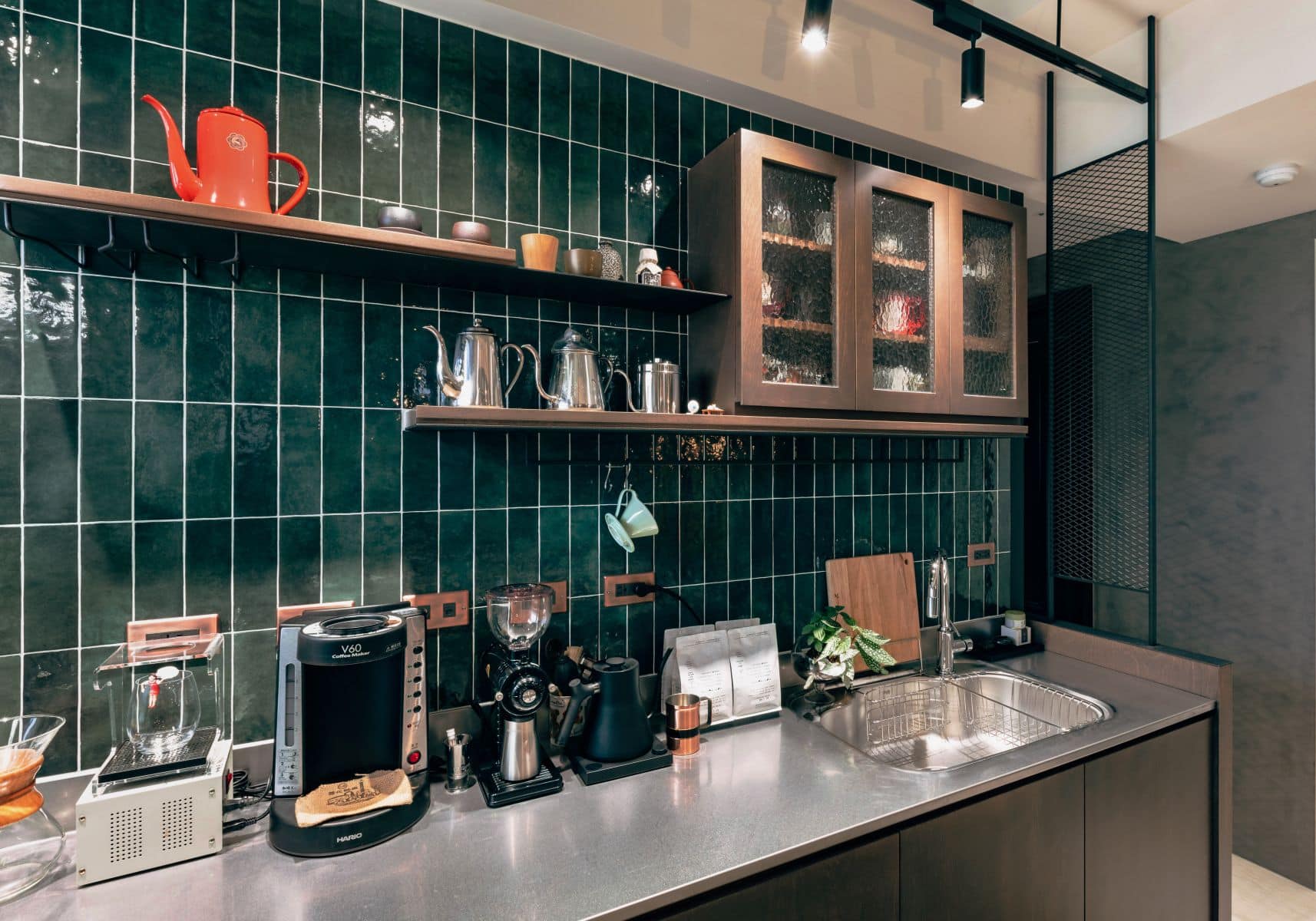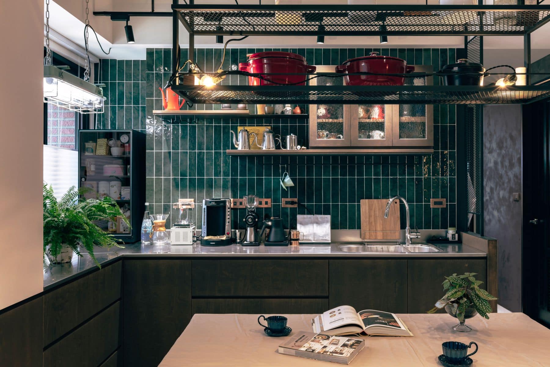 精緻工業感的實現,高度依賴於對細節設計的掌握。在廚房區域,背牆採用了深墨綠色長條磚,其光滑的釉面與深色調,在吊掛的暖色燈光下,散發出獨特的復古光澤,成為空間的視覺焦點。水槽上方設置了金屬網格結合木層板的吊架,用於展示屋主的鑄鐵鍋具和咖啡器具,這既是收納也是展示藝術,完美結合了功能性與風格化。