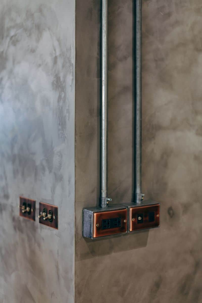更值得一提的是電路和開關的細節設計。裸露在外、沿牆面垂直佈置的金屬導管,是經典工業感的元素之一。與之搭配的,是復古銅製面板的開關和插座,以及外露式金屬接線盒。這些精挑細選的配件,以其獨特的材質和線條,為牆面增添了工業時代的精緻感和手工藝的溫度,將實用機能提升至美學鑑賞的高度,成為空間中不可忽視的設計亮點。